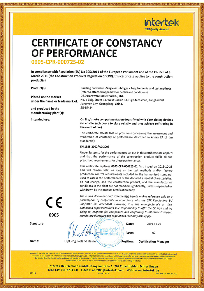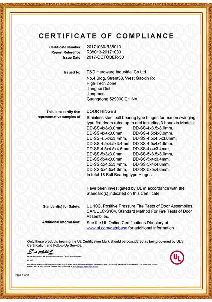 D&D fire rated door hinge comply to ANSI,BHMA,UL and BS EN/CE, Suitable for Residential Building, Office Building,Education, Healthcare, Hotel, Government applications.We can supply international branded quality at factory cost with mechanical guarantee and after sales service.